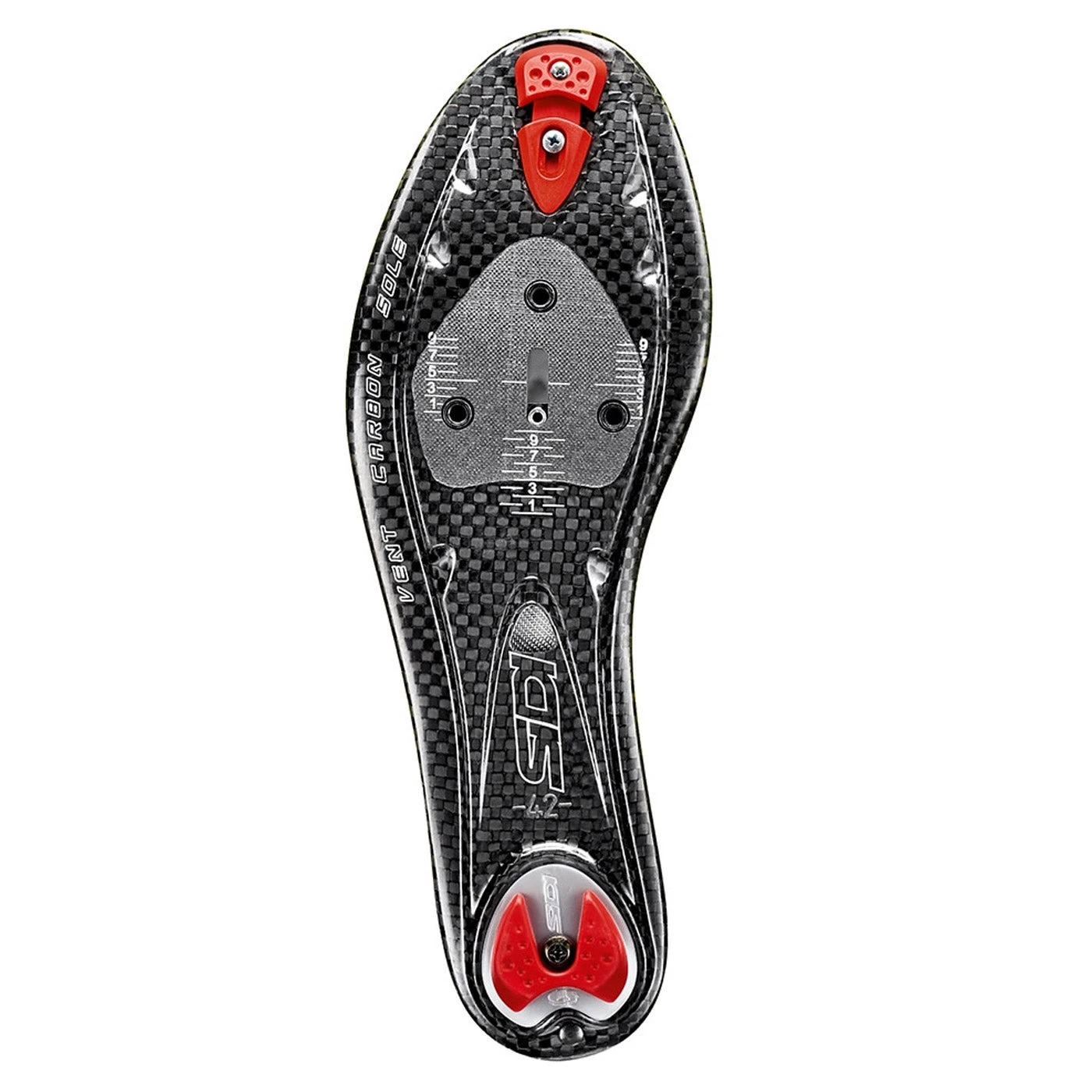 - La SUOLA VENT CARBON adotta un leggero e sostituibile tacco in poliuretano per migliorare la camminabilità ed una presa d’aria integrata, sostituibile. I vantaggi chiave della SUOLA VENT CARBON non sono solamente un maggior trasferimento di potenza, grazie alla sua leggerezza e rigidità, ma anche un maggior comfort in caso di elevate temperature. La SUOLA VENT CARBON è disegnata con una presa d’aria integrata e canali d’aria per la ventilazione e dispersione del calore. La presa d’aria può essere aperta o chiusa, per un comfort ottimale in ogni stagione. La SUOLA VENT CARBON è fatta a mano, esclusivamente con fibra di carbonio a tramatura intrecciata, che massimizza la rigidità consentendo un grado minimo di flessione controllata in punta. Questa flessione attentamente studiata, allevia biomeccanicamente lo stress ai tendini plantari e contribuisce a migliorare la circolazione. Sulla SUOLA VENT CARBON è stampata una scala di allineamento della tacchetta, che consente la regolazione di 10 mm in avanti ed indietro e la possibilità di memorizzare la posizione della tacchetta Look, facilitandone la sostituzione.